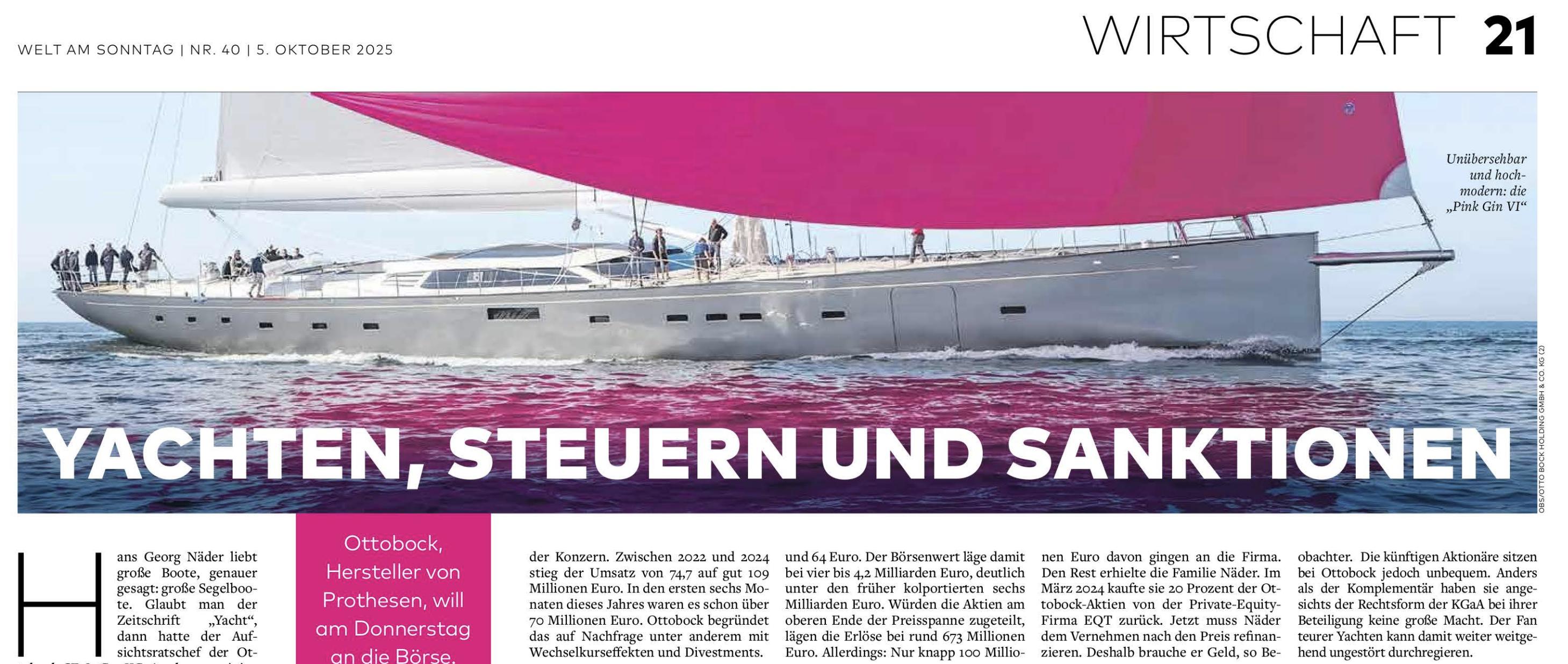 Hans Georg Näder liebt große Boote, genauer gesagt: große Segelboote. Glaubt man der Zeitschrift “Yacht”, dann hatte der Aufsichtsratschef der Ottobock SE & Co. KGaA schon so einige davon. Im Jahr 2017 ließ er zum Beispiel bei der ebenfalls zum Näder-Imperium gehörenden Werft Baltic Yachts die “Pink Gin VI” im finnischen Pietarsaari zu Wasser. Ein Wahnsinnsschiff: 54 Meter lang, Rumpf aus Carbon, schnell. Moderner geht’s kaum. Im Juni 2023 soll er sie wieder verkauft haben.